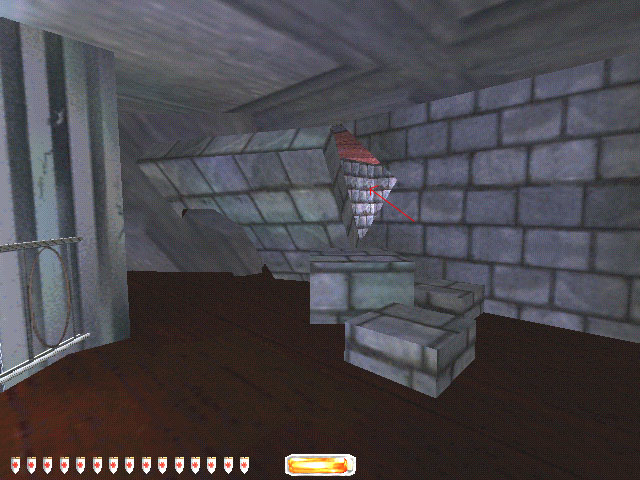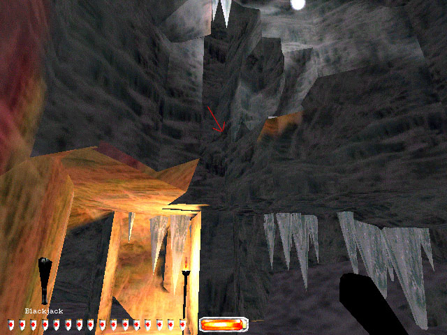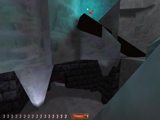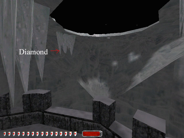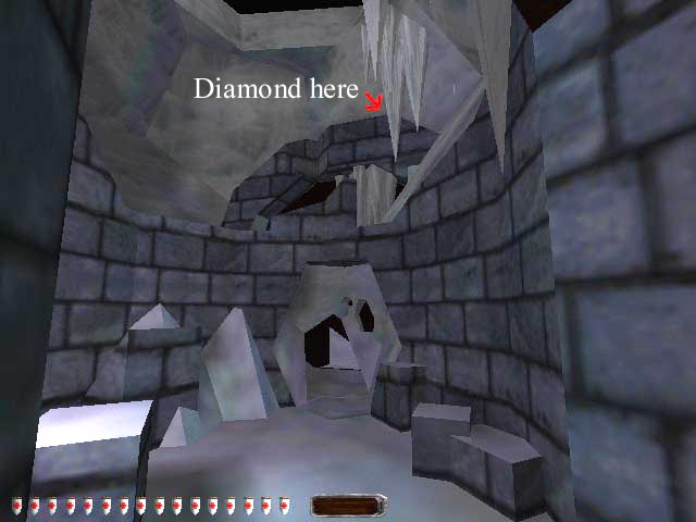 Go up the staircase mentioned above to the next landing. Up here there is a broken section of floor. Run down the broken part to the floor below. Go out a doorway into an ice cave and there are some stone blocks on the floor. Up above there is an archway. You have to climb the rubble, get up on the ledge and right to the top of the highest wooden part to find the last diamond.